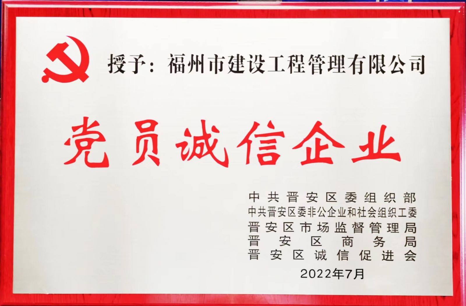 9月22日上午,晉安區(qū)委組織部等部門(mén)聯(lián)合舉辦晉安區(qū)第二批“黨員誠(chéng)信示范店”“黨員誠(chéng)信企業(yè)”授牌表彰會(huì),我司榮獲“黨員誠(chéng)信企業(yè)”榮譽(yù)稱(chēng)號(hào)。這個(gè)稱(chēng)號(hào)是對(duì)我司長(zhǎng)期以來(lái)誠(chéng)信經(jīng)營(yíng)的肯定,也是對(duì)我們今后堅(jiān)持誠(chéng)信合法經(jīng)營(yíng)的一種鞭策。